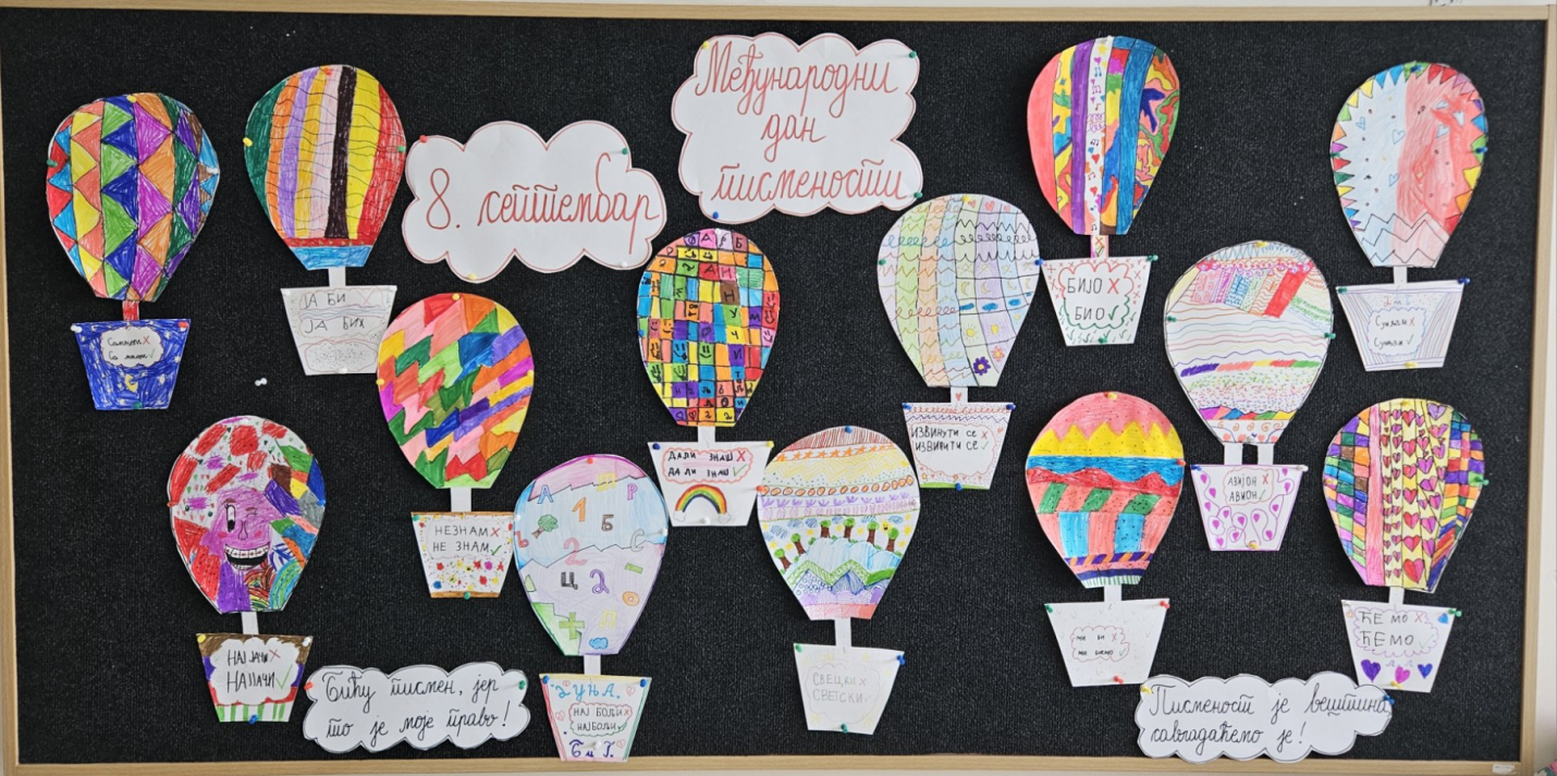 Међународни дан писмености обележили смо 8. септембра. Ученици су се кроз пригодну презентацију, коју је направила библиотекарка Драгана Рашуо, подсетили значаја писмености, да је то право сваког човека и да је то вештина коју ћемо уз труд заједно савладати. Затим су се у оквиру својих одељења, са својим учитељима и наставницима, на различите начине, кроз игру, креативне радионице, писање писма, израду одељенских паноа, подсетили правописних правила и истакли важност богађења и неговања српског језика.