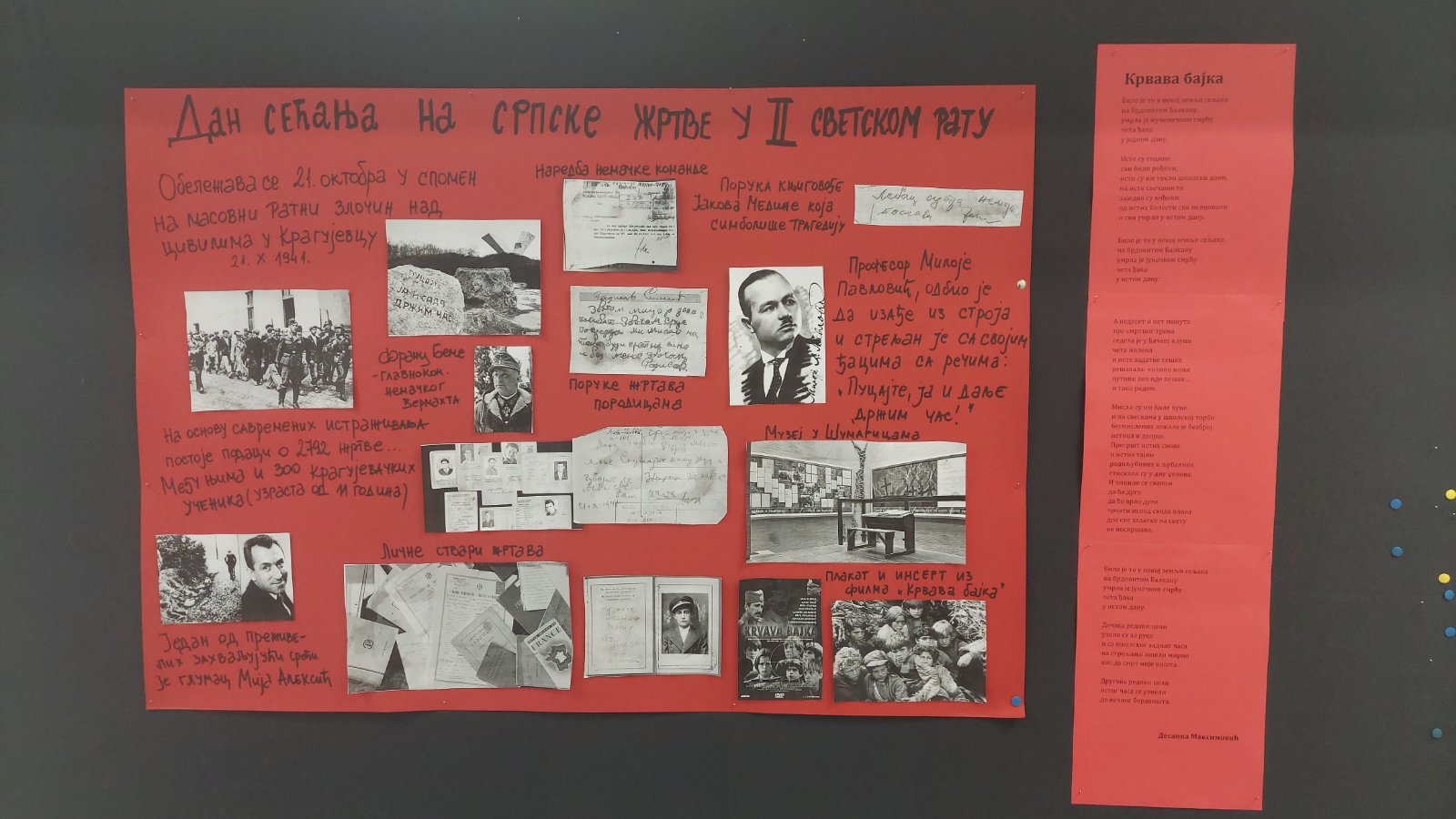 Тим поводом, ученици млађих и старијих разреда наше школе подсетили су нас, да смо ми, потомци невиних жртава, дужни да памтимо и поштујемо ту страшну и превисоку цену коју је наш народ плаћао за слободу.